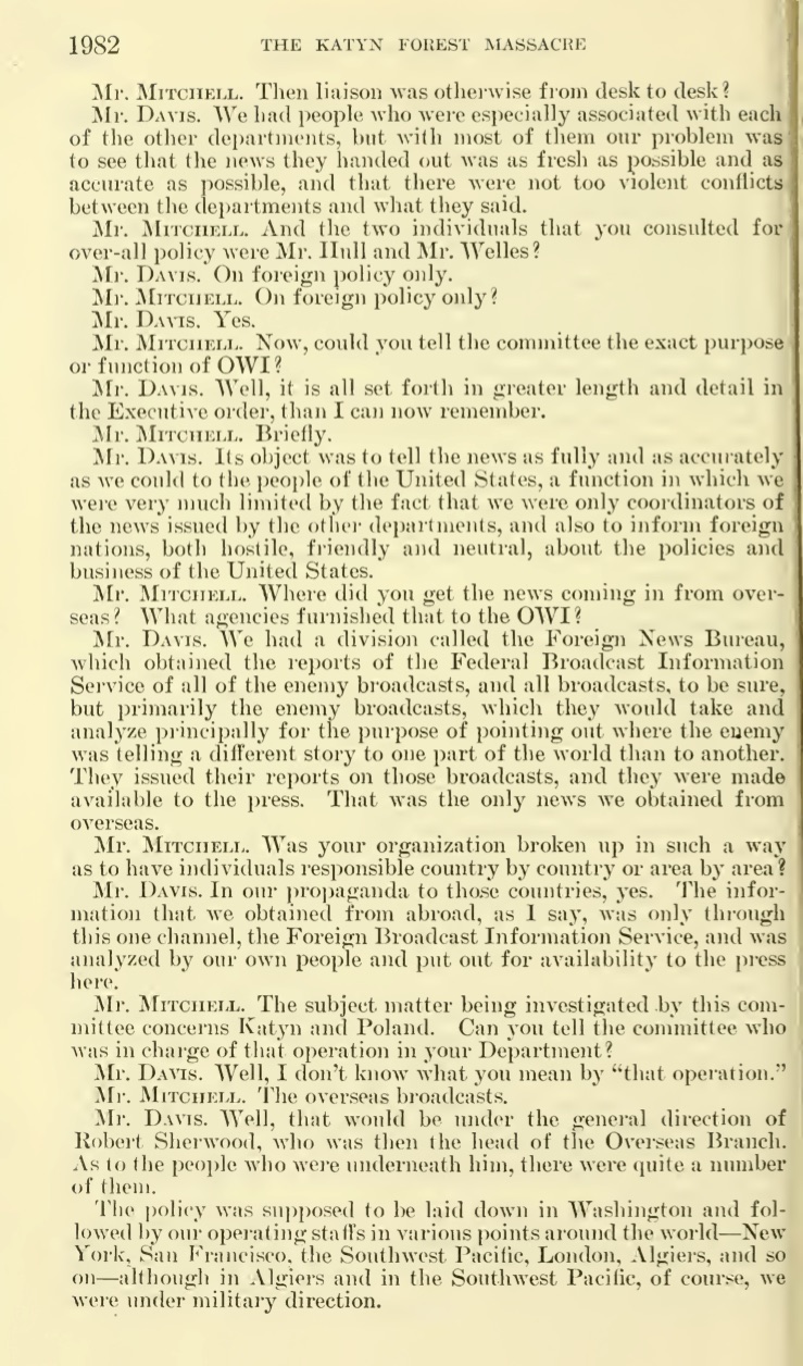TESTIMONY OF ELMER DAVIS, NEWS BROADCASTER AND COM- MENTATOR, AMERICAN BROADCASTING CO., WASHINGTON, D. C. 1982