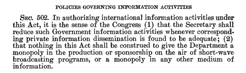 - U.S. Congress, U.S. Information and Educational Exchange Act of 1948 (Smith–Mundt Act), Pub. L. No. 80-402, 62 Stat. 6 (January 27, 1948), https://www.govinfo.gov/content/pkg/STATUTE-62/pdf/STATUTE-62-Pg6.pdf (accessed February 25, 2026).