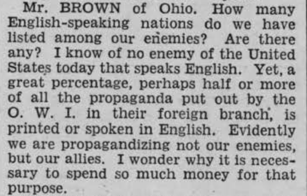 At that time, VOA foreign-language services were required to translate and use news prepared by the central English-language newsroom and could not originate independent reporting without special authorization. Most funding and staffing resources were devoted to English-language programming. Already during World War II members of Congress noted that much of VOA’s wartime broadcasting effort and spending went to English-language programs even though no English-speaking country was at war with the United States.21