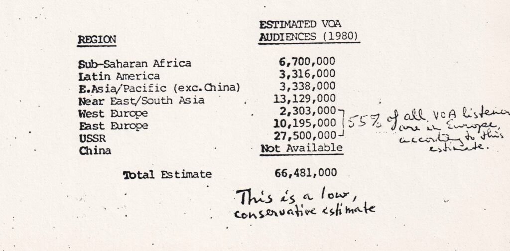 The Voice of America English broadcasts were mostly about global news, U.S. news, and, to some degree, at least then, public diplomacy. It presented the United States to the world. But in repressive systems, listeners hungry for survival information about their own countries often looked elsewhere.
