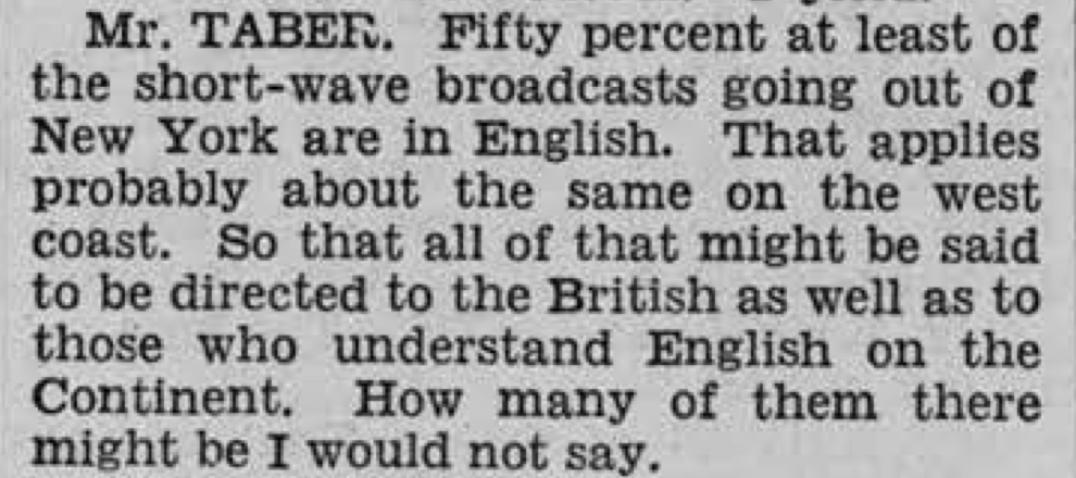 Excerpt from the Congressional Record, May 26, 1944 (p. 5022), containing remarks by Representative Harold C. Taber of New York stating that approximately 50 percent of Voice of America shortwave broadcasts transmitted from New York were in English.