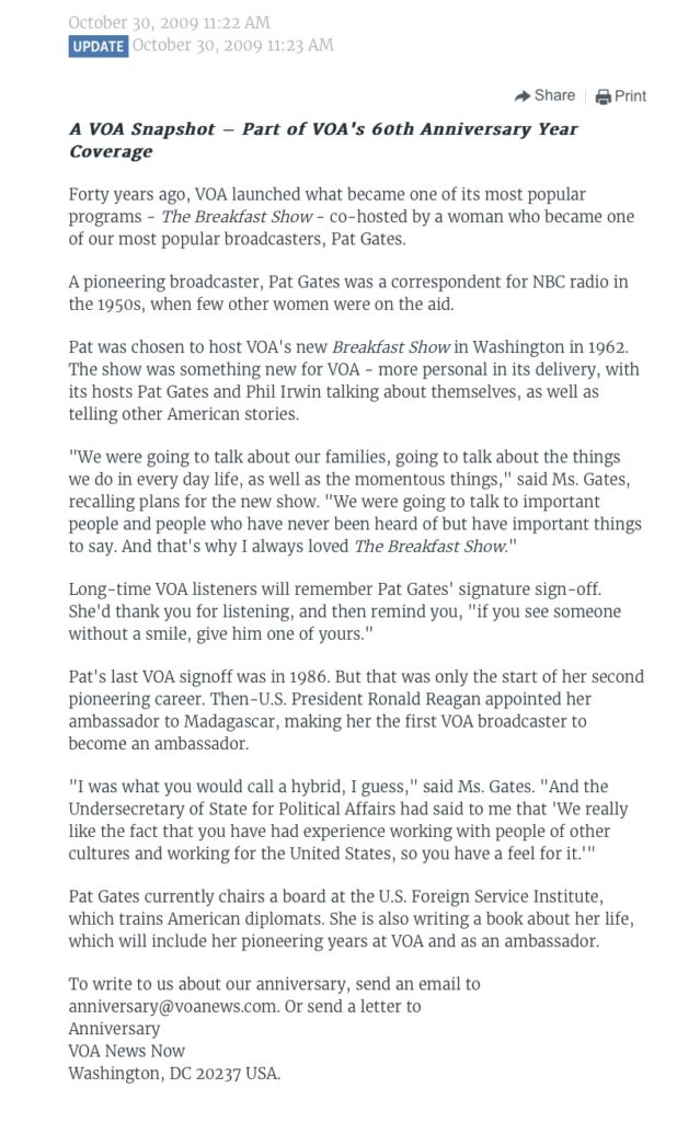 It was one of the best hiring decisions made at the Voice of America. With Pat Gates, The Breakfast Show became something more than a format.