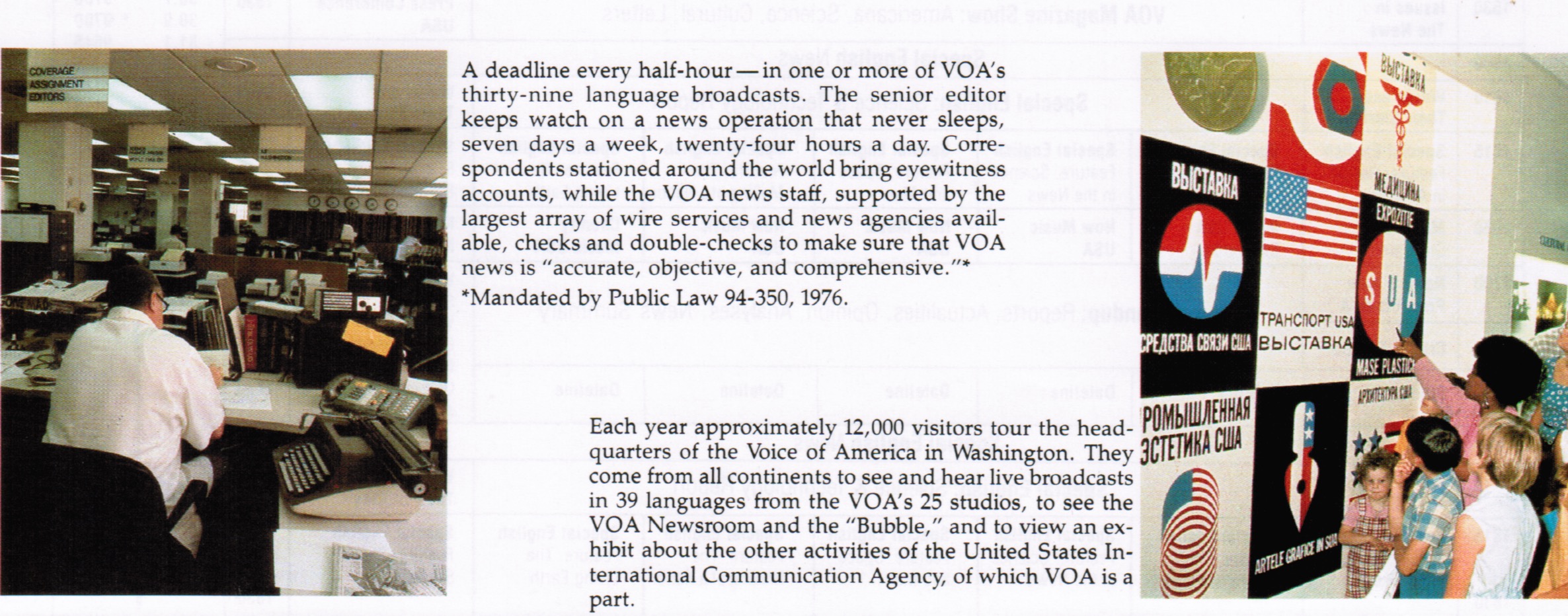 A deadline every half-hour—in one or more of VOA’s thirty-nine language broadcasts. The senior editor keeps watch on a news operation that never sleeps, seven days a week, twenty-four hours a day. Correspondents stationed around the world bring eyewitness accounts, while the VOA news staff, supported by the largest array of wire services and news agencies avail- able, checks and double-checks to make sure that VOA news is “accurate, objective, and comprehensive.