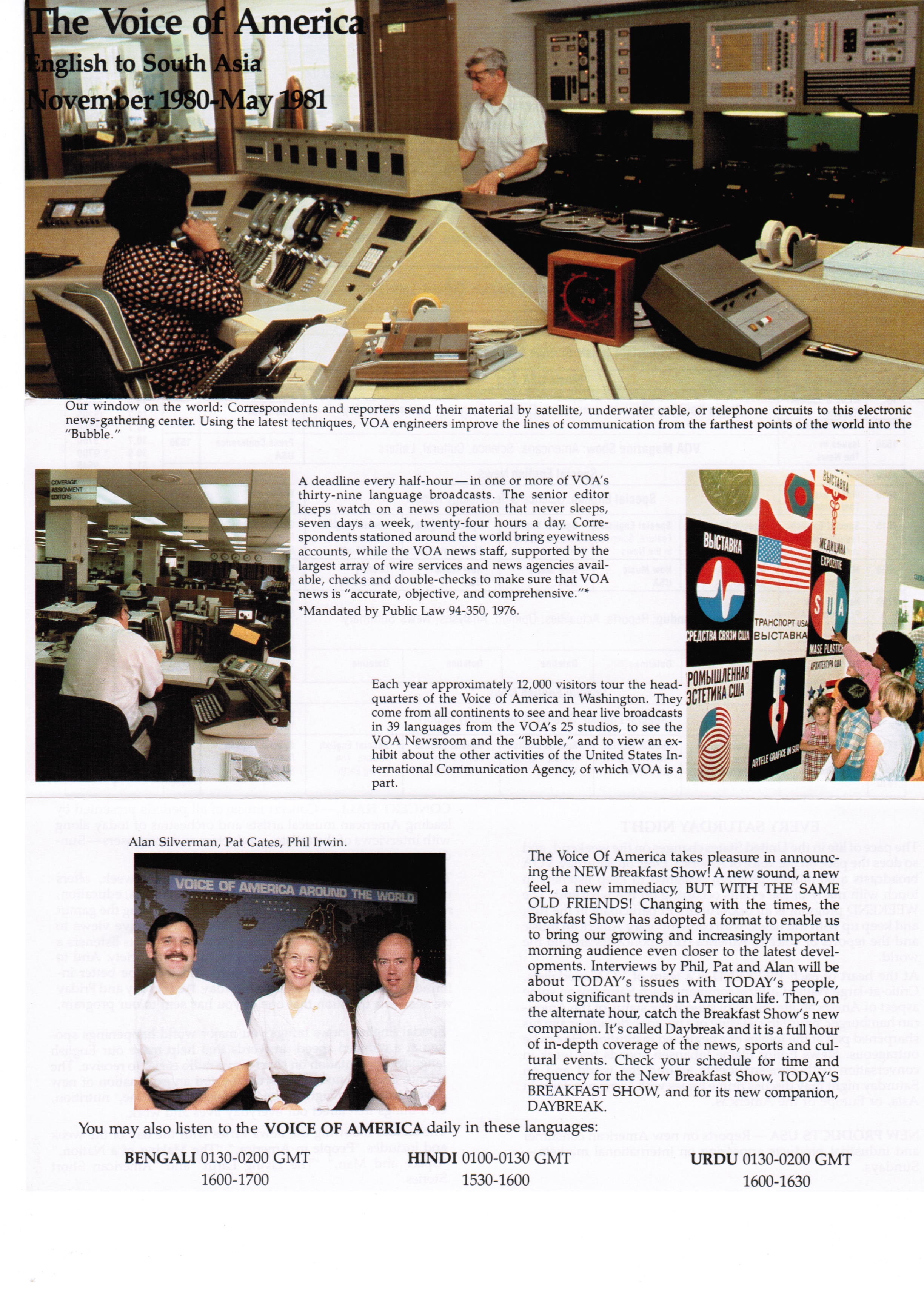 The Voice Of America takes pleasure in announcing the NEW Breakfast Show! A new sound, a new feel, a new immediacy, BUT WITH THE SAME OLD FRIENDS! Changing with the times, the Breakfast Show has adopted a format to enable us to bring our growing and increasingly important morning audience even closer to the latest developments. Interviews by Phil, Pat and Alan will be about TODAY’S issues with TODAY’S people, about significant trends in American life. Then, on the alternate hour, catch the Breakfast Show’s new companion. It’s called Daybreak and it is a full hour of in-depth coverage of the news, sports and cultural events. Check your schedule for time and frequency for the New Breakfast Show, TODAY’S BREAKFAST SHOW, and for its new companion, DAYBREAK.
