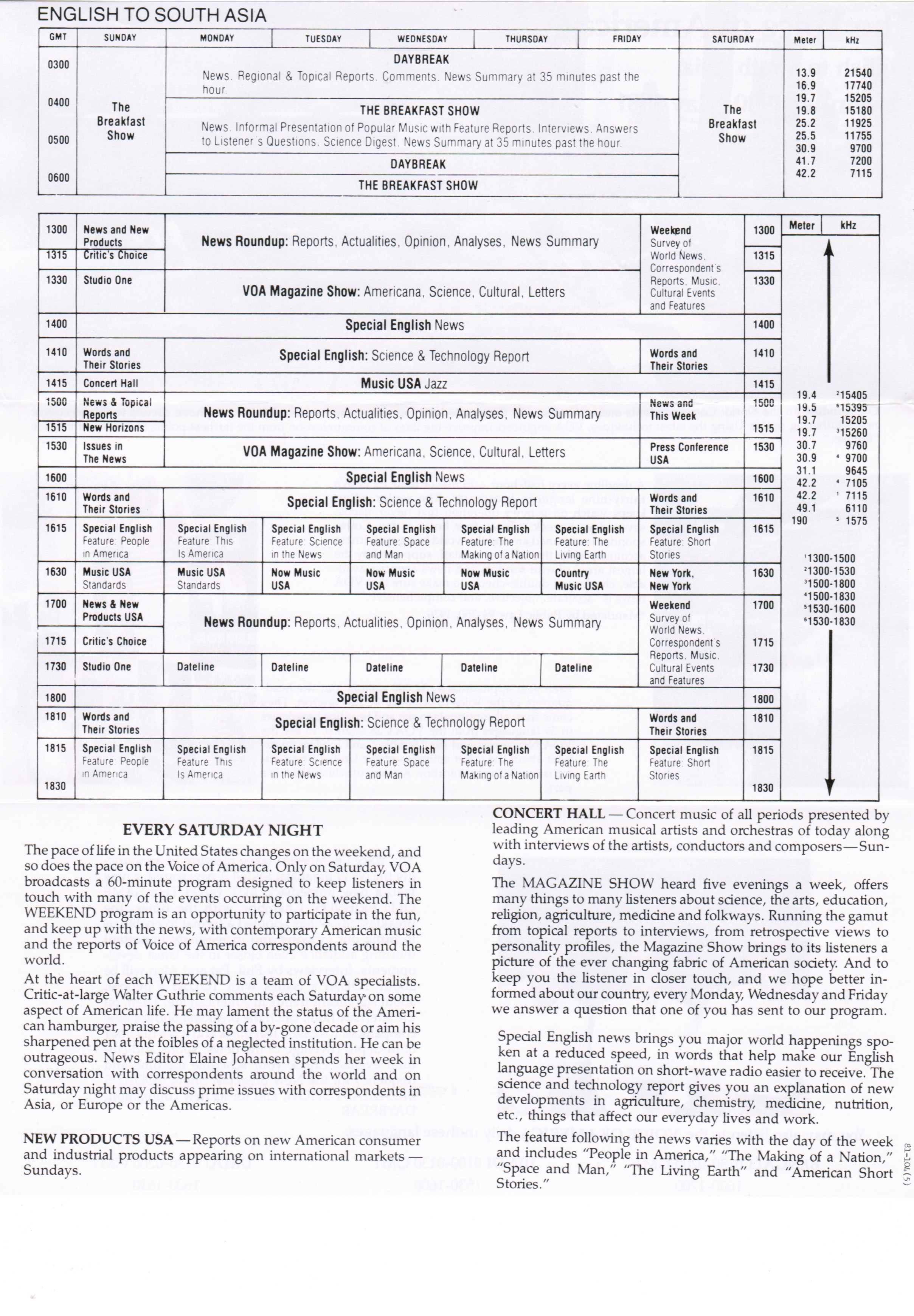 On Saturday nights, VOA broadcast a 60-minute program titled Weekend, reflecting the slower pace of American life on weekends. The program combined contemporary American music, news summaries, and commentary from VOA correspondents worldwide.
