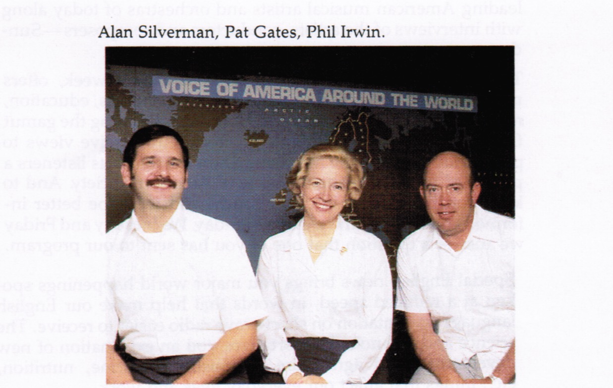 A photo from the Voice of America 1980-1981 Program Guide shows Pat Gates with her VOA Breakfast Show co-hosts, Phil Irwin and Alan Silverman.